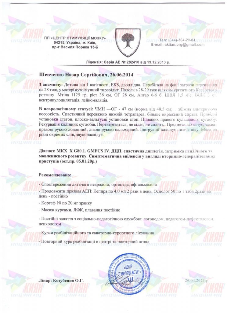 Лікування хлопчика розпочали, щойно стан здоров’я дозволив проводити терапію. Нещодавно Назар повернувся додому після курсу реабілітації і вже може похвалитися неабиякими результатами: він почав більше розмовляти, із ним уже можна вести діалог, Назар почав краще спати. Його спина зміцніла, опора на руки збільшилася, а спастика зменшилася, кисті рук тепер краще відкриваються.