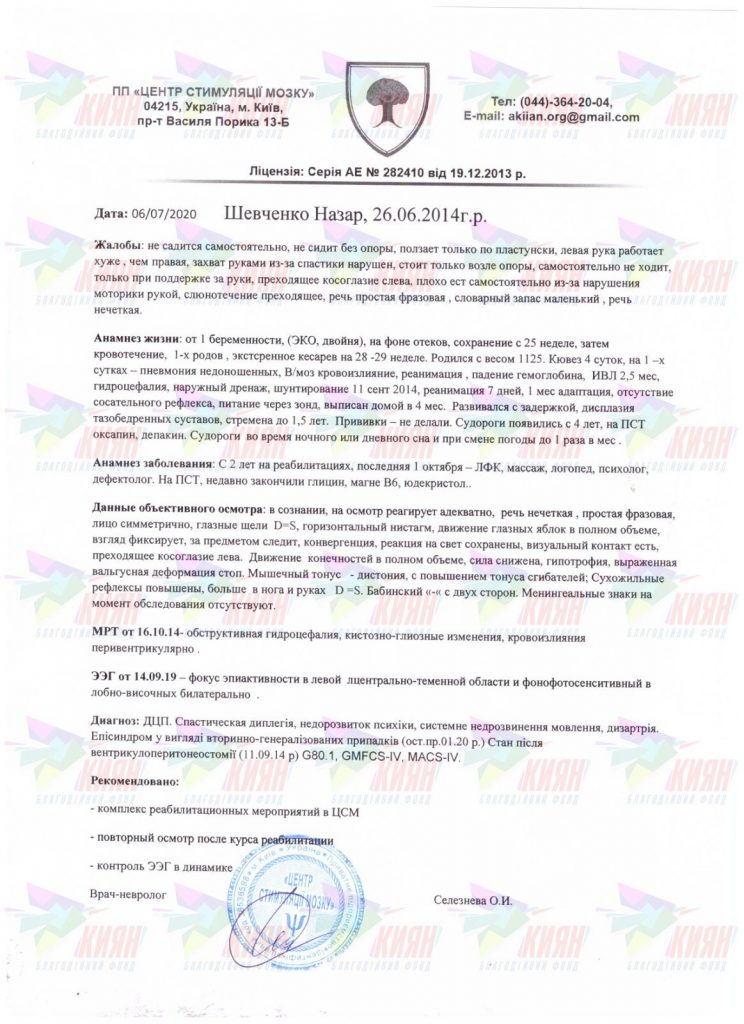 На щастя, хлопчик почав дихати! Після цього почали лікувати гідроцефалію: зробили операцію – встановлення шунтуючої системи, після цього була ще одна операція на мозку, пізніше – ще 2 операції пахових гриж, і діагноз – ДЦП, пізніше до всього додалася симптоматична епілепсія. Зараз Назару 6 років, і він бореться зі своїми діагнозами. Це розумний і сильний духом хлопчик, якому потрібна наша підтримка!