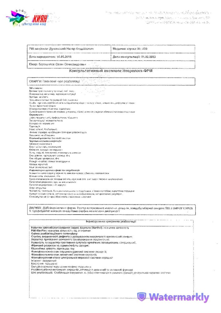 Завдяки правильному та якісному лікуванню Назар пішов до школи на інклюзивне навчання, він уже може краще контролювати рухи головою, стояти на четвереньках та відтискатися від рук, у нього зміцніла спина, покращився сон, зменшилася свастика в руках та ногах. Мовлення хлопчика покращилося, його емоційний стан задовільний, він хоче і надалі працювати над собою, щоб подолати хворобу та навчатися чогось нового.
