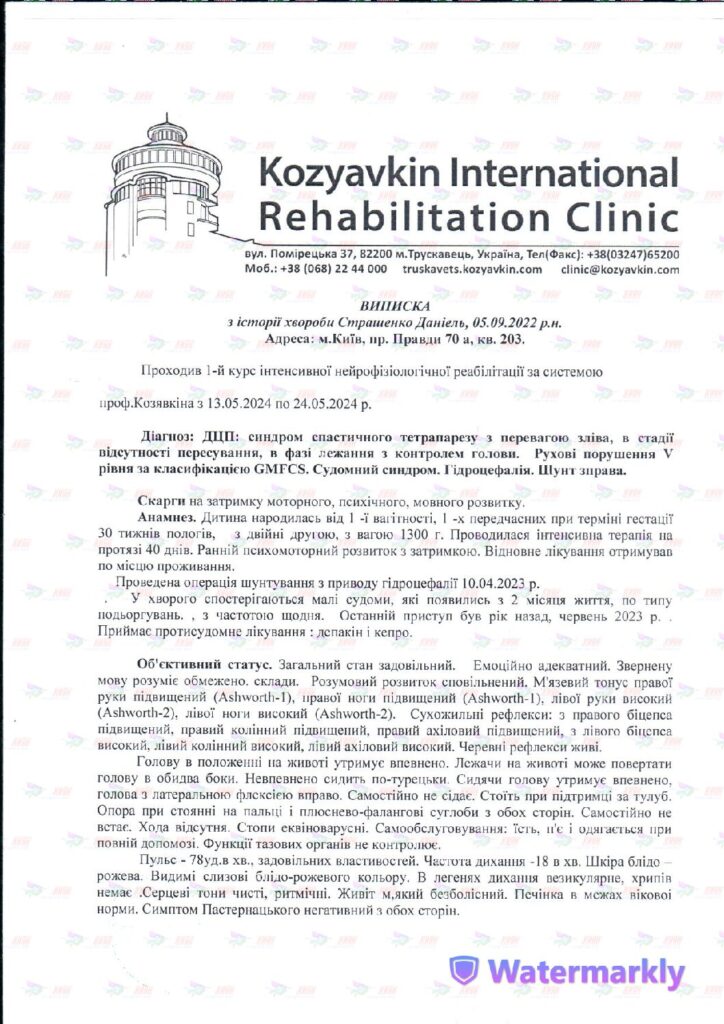 Зараз хлопчику рік і 9 місяців, він уже тримає голівку, перевертається та намагається повзати із допомогою дорослих, проявляє емоції. Батьки намагаються забезпечити сину систематичні реабілітації, візити до логопеда (Даня почав вимовляти склади), з хлопчиком також займаються вдома.