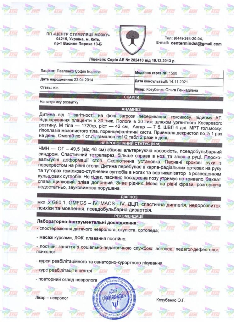 Діагноз: G.80.0 ДЦП: спастичний тетрапарез, недорозвиток психіки та мовлення. Генералізовані моторні напади (епілептичні спазми), структурна фокальна епілепсія