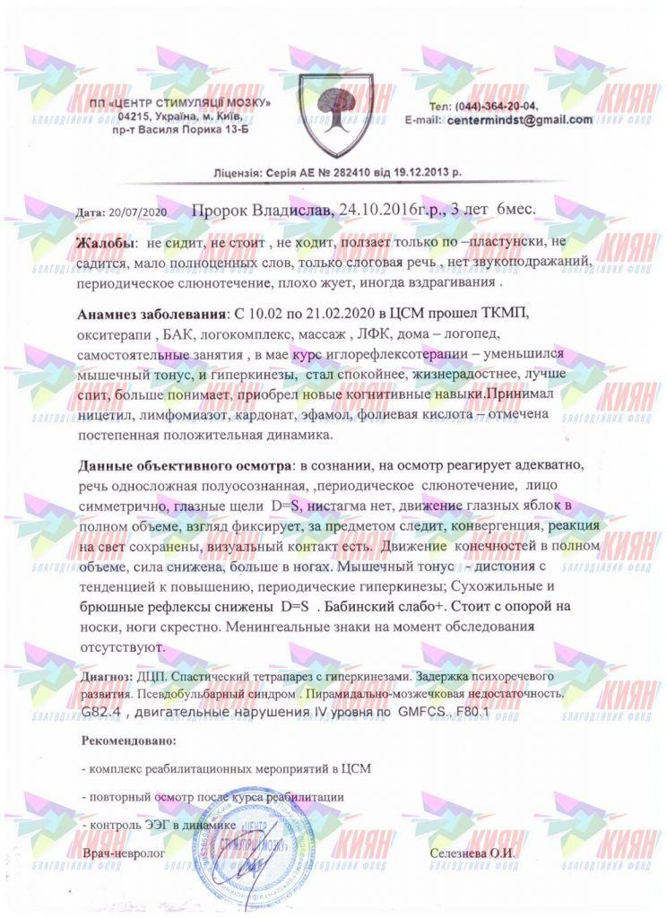 Як же ми віримо в Микиту: благодійники, батьки, його рідні, лікарі та реабілітологи… Цей хлопчик дуже надихає всіх, хто його знає. Хлопчик переніс наслідки важкої перитинальної асфіксії та натальної травми шийного відділу хребта, у нього ДЦП, спастичний тетрапарез, співдружня східна косоокість, синдром ліквородинамічних порушень та епісиндром з частими генералізованими нападами. Попри всі ці діагнози, Микита бореться за своє здоров’я.