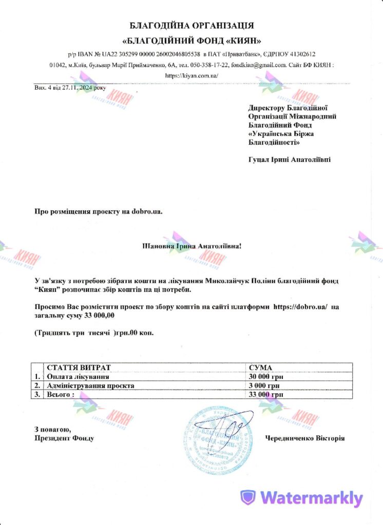 Поліна народилася у травні 2023 році. Вагітність мами проходила добре, але на останньому УЗД було виявлено незначне запалення шлуночків головного мозку крихітки. Коли дівчинці виповнився місяць, її повели на планові огляди. Так перша нейросонографія Полі показала, що є проблема та був внутрішньошлуночковий крововилив. Далі було МРТ, яке показало гідроцефалію та збільшення шлуночків, та консультація в «ОХМАТДИТі». На щастя, операція була не потрібна.