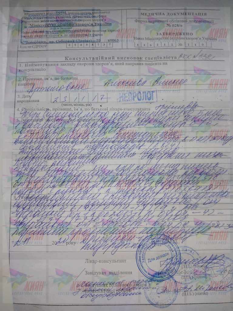 У Софії була зупинка серця, дівчинці робили переливання крові, а наступні результати аналізів та обстеження виявили гідроцефалію, бронхолегеневу дисплазію, судомний синдром, а як наслідок – ДЦП.