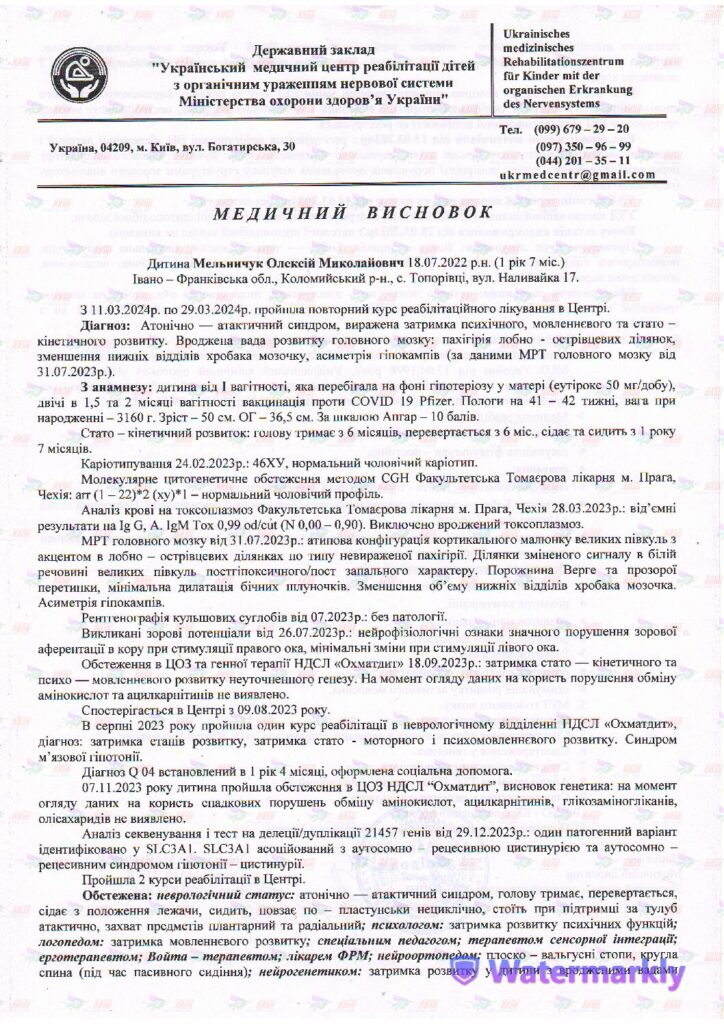 Малюк відразу пройшов кілька курсів масажу та ЛФК, і вже у 7 місяців почав тримати голівку, проте через сильно знижений тонус мʼязів досі не міг сідати та повзати, хоча й мав силу на перевороти власного тіла. В рік Олексієві діагностували затримку розвитку, вроджену ваду розвитку головного мозку, знижений тонус мʼязів.