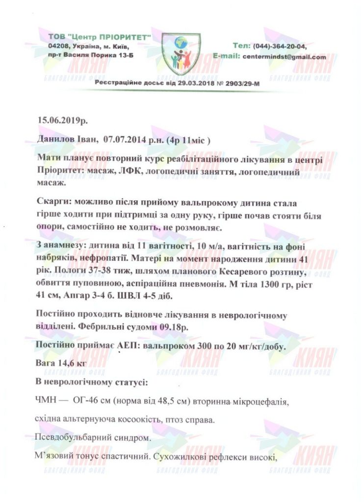 Іван – перший син в родині Данилових. Малюк народився раніше поставленого терміну, його мамі тоді було 41. Після народження хлопчик не закричав, пуповина обвила його шию, він не міг дихати! Тому Івана терміново рятують: спочатку апаратом ШВЛ, після цього – в реанімації. Іван вижив!..
