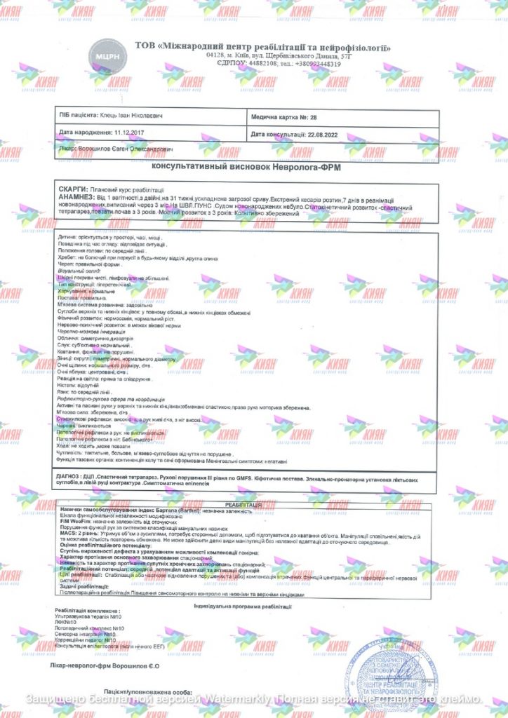 Діагноз: ДЦП, спастична квадриплегія з руховими порушеннями IV рівня по GMFCS. Затримка статокінетичного, психо-мовного розвитку. Збіжна косоокість обох очей, гіперметропія обох очей. Еквіновальгусна деформація стоп