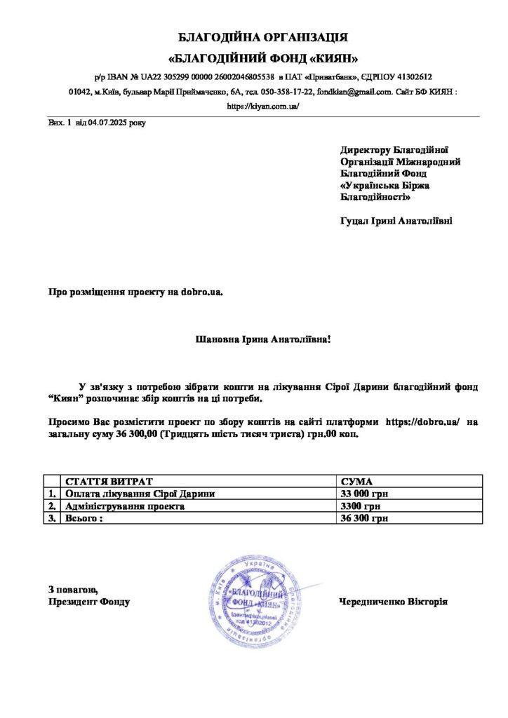 2-річна Даринка — єдина дитина в родині, яка з самого народження бореться за право на повноцінне життя. Ще до появи на світ лікарі ставили дівчинці важкі діагнози, а після народження, в 5-місячному віці, в Даринки зʼявилися судоми. На жаль, судоми «стерли» всі навички, які встигла освоїти крихітка.