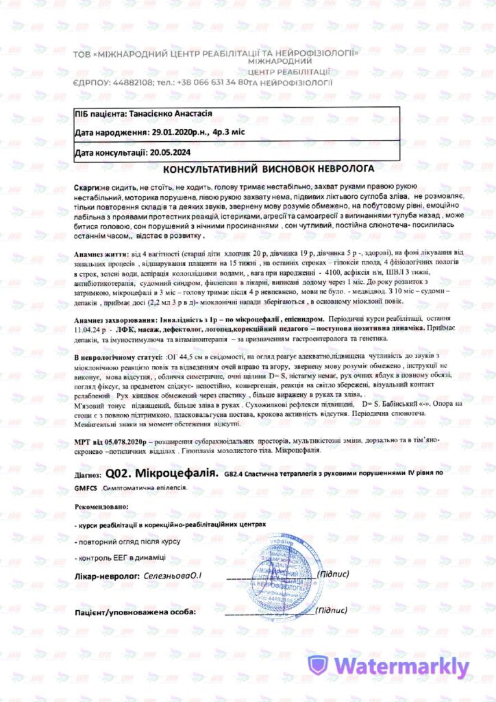 Діагноз: мікроцефалія, спастичний тетрапарез з відсутністю самостійного сидіння, стояння та ходи. Епісиндром (генералізовані міоклонічні напади), затримка психо-мовленнєвого розвитку. Згинально-пронаторна контрактура лівого плечового суглобу, вивих голівки лівої променевої кістки, підвивих обох стегон, вальгусна установка обох ступнів, coxa valga