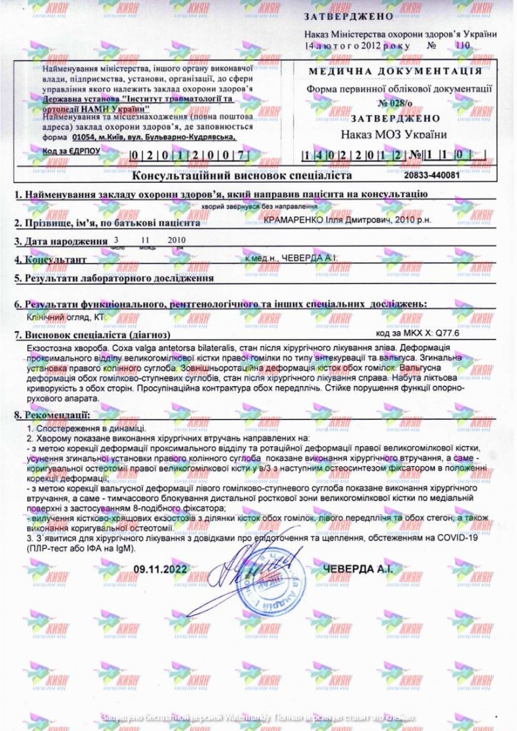Діагноз: Екзостозна хвороба. Coxa valga antetorsa bilateralis, стан після хірургічного лікування зліва. Деформація проксимального відділу великогомілкової кістки правої гомілки по типу антекурвації та вальгуса. Згинальна установка правого колінного суглоба. Зовнішньоротаційна деформація кісток обох гомілок. Вальгусна деформація обох гомілково-ступневих суглобів, стан після хірургічного лікування справа. Набута ліктьова криворукість з обох сторін. Просупінаційна контрактура обох передплічь. Стійке порушення функції опорно-рухового апарата.