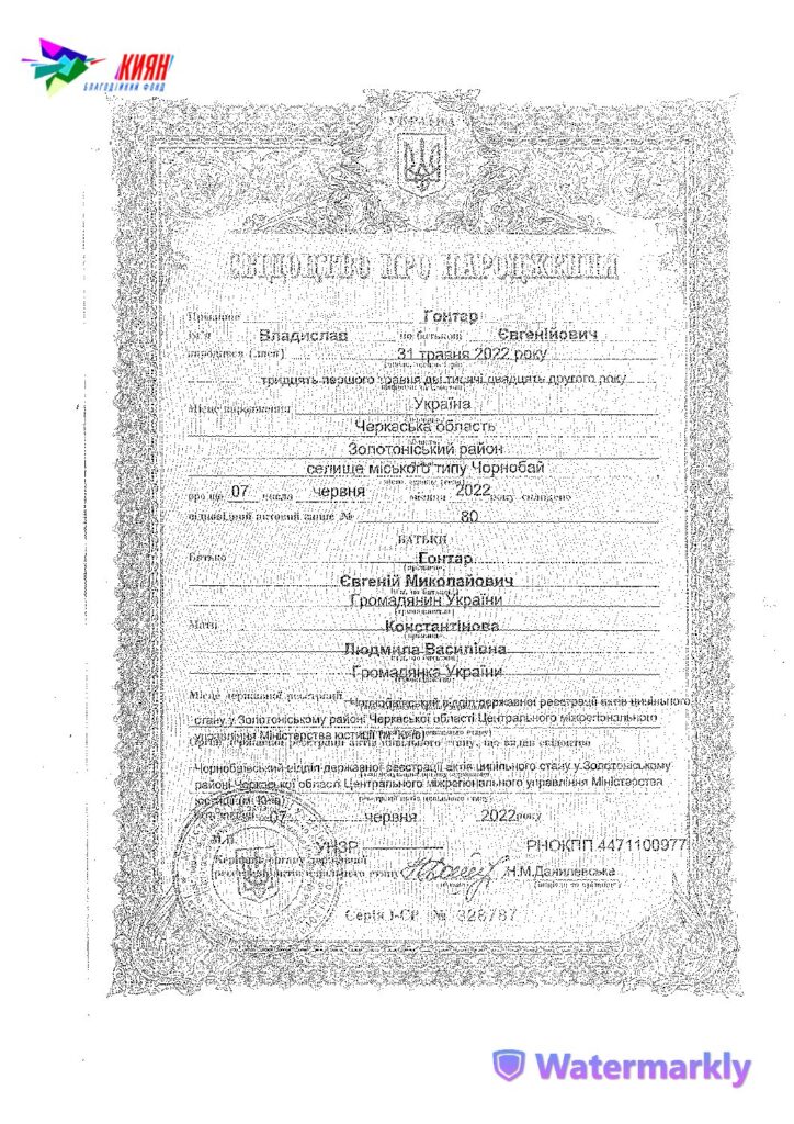 Повне ім’я: Гонтар Владислав Євгенійович, 31.05.2022 р.