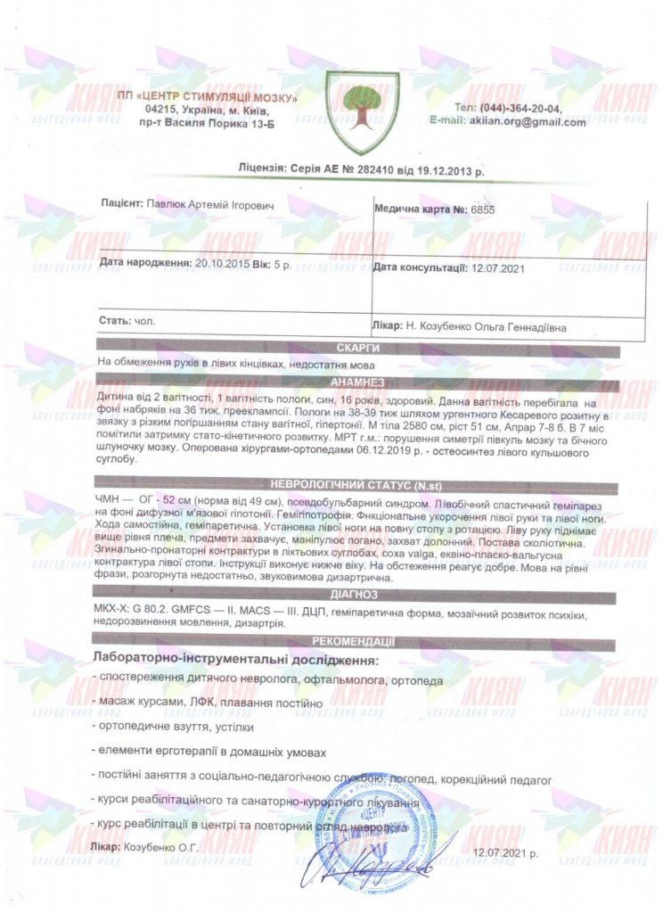 Історія Артемової хвороби розпочалося після народження. Коли хлопчику виповнилось 9 місяців, він так і не почав перевертатися, самостійно сидіти. А у віці 1,5 року на консультації в лікаря маму приголомшили: у її сина ДЦП і геміпарез. Зараз Артем ходить, намагається бігати, хоча і частенько падає, і краще вимовляти слова. Але йому ще потрібно вчитися користуватися рукою, знайомитися з дрібною моторикою і намагатися ставити ніжку на п’ятку.