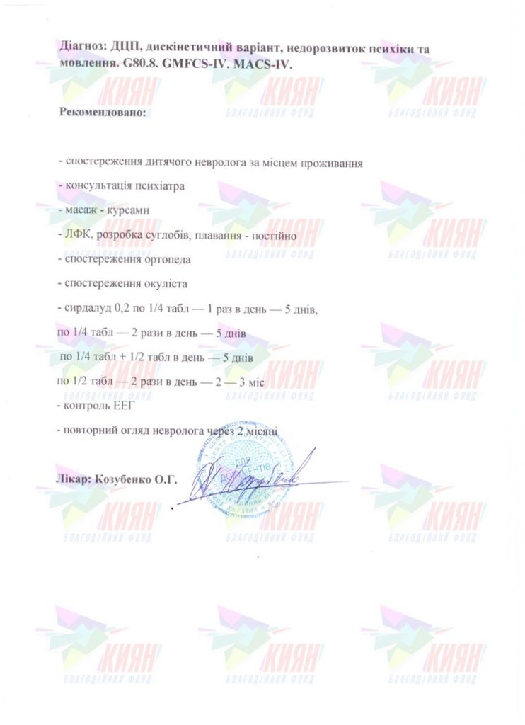 Діагноз: ДЦП, спастичний тетрапарез, псевдобульварний синдром, затримка всіх видів розвитку, перинатальна енцефалопатія, натальна травма ШВХ