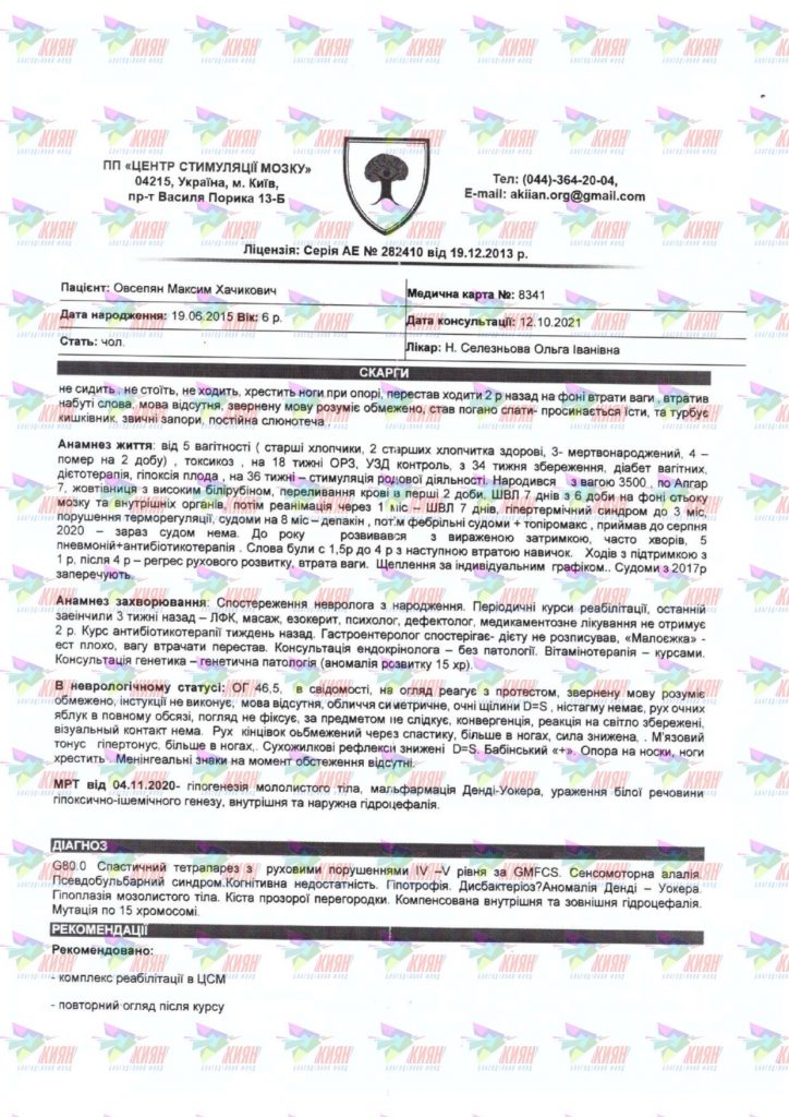 Зважаючи на діагноз Максима, йому постійно потрібно займатися і відвідувати реабілітації, проте батьки хлопчика не в змозі їх самостійно оплачувати через скрутне матеріальне становище. Проте разом ми можемо допомогти Максу і відправити його на таке необхідне лікування!
