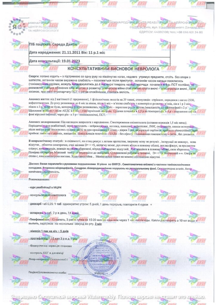 Діагноз: Мікроцефалія,стійкі необоротні рухові порушення поєднані з вираженими порушеннями опорно-рухового апарату, порушення мови. (Q 02 вроджена вада розвитку головного мозку, мікроцефалія, венозна ангіома лівої лобної ділянки. G 80.3 дистонічна тетраплегія. G 40.2 структура епілепсія, часті фокальні з вторинною генералізацією тоніко-клонічні напади F 84 РАС.