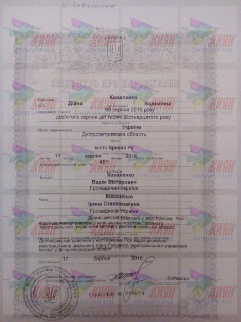 ФИО: Коваленко Діана Вадимівна, 09.08.2016 р.