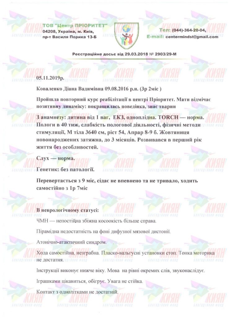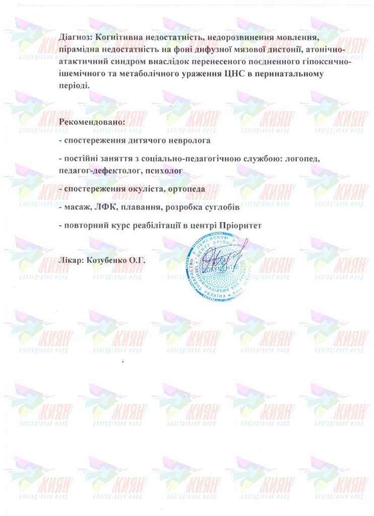 Діагноз: наслідки нейроінфекції, атонічно-астатичний синдром із вираженою затримкою у вигляді ходи, ЗПМР
