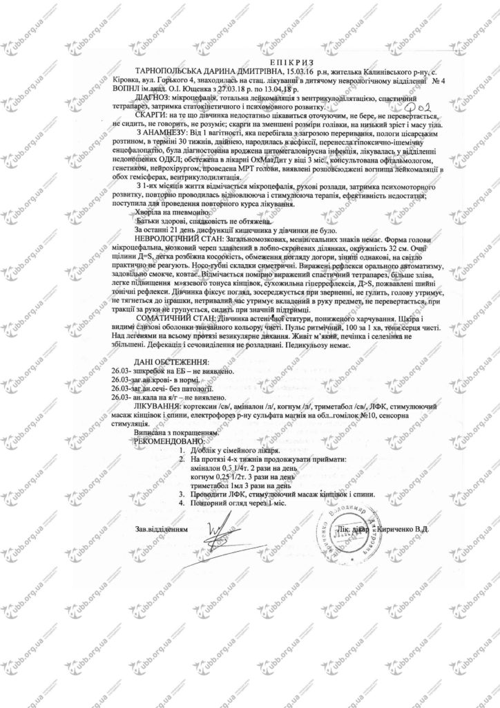 Диагноз:мікроцефалія, тотальна лейкомаляція з вентрикулоділятацією, спастичний тетрапарез, затримка статокінетичного і психомовного розвитку