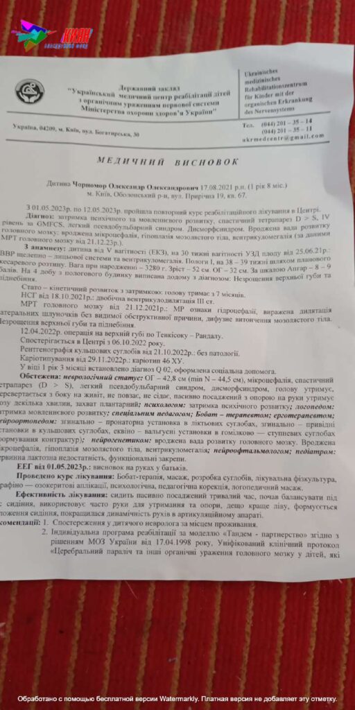 Діагноз: cпастичний тетрапарез, IV рівень за GMFCS, легкий псевдобульбарний синдром. Дисморфсиндром. Вроджена вада розвитку головного мозку: вроджена мікроцефалія, гіпоплазія мозолистого тіла