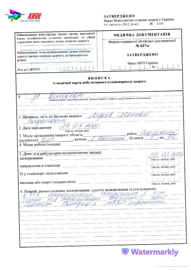 Маленький Матвій після народження потрапив до реанімації під апарат ШВЛ. Хлопчика оглянув хірург, після чого в нього діагностували перфорацію тонкого кишківника, каловий перитоніт, ранній неонатальний сепсис, набряк головного мазку та ентероколіт. На 5 добу малюка прооперували, вивели ілеостому (це процедура виведення тонкої кишки на поверхню шкіри) та перевели на ентеральне харчування. Так Матвій провів у лікарні 3 місяці.