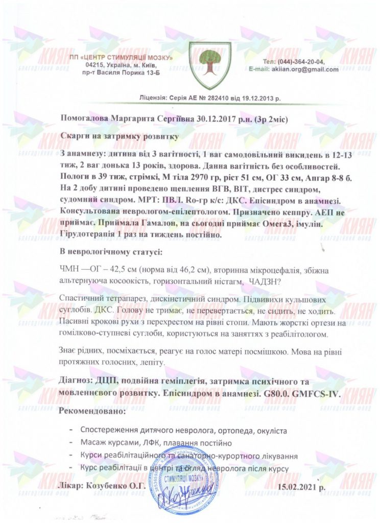 За плечима Рити вже 4 пройдені курси реабілітації. Зараз лікарі відзначають значну динаміку в рухових навичках дівчинки, логопед також бачить результати: Рита стала уважною на заняттях, вона дає зворотний зв’язок і вимовляє нові звуки. Дівчинка починає фіксувати погляд, повзати по-пластунськи, її тіло розслабилося.