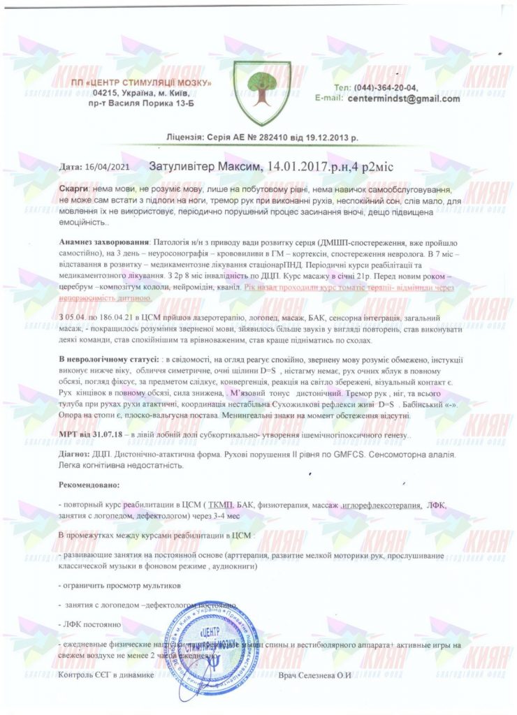 Діагноз: ДЦП. Дистонічно-атактична форма. Рухові порушення II рівня по GMFCS. Сенсомоторна алалія. Легка когнітіивна недостатність