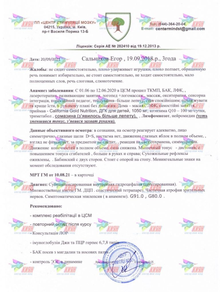 Цілий місяць хлопець пробув у комі, цілий місяць мама молилася за нього, а лікарі боролися за його життя. Між іншим, у цей час у Єгора також діагностували гідроцефалію, провели операцію і встановили шунт. На щастя, хлопчик прийшов у себе! Але з часом стало зрозуміло, що Єгор почав відставати у розвитку. Тоді лікарі рекомендували хлопчикові проходити систематичне реабілітаційне лікування, яке допоможе Єгорові.