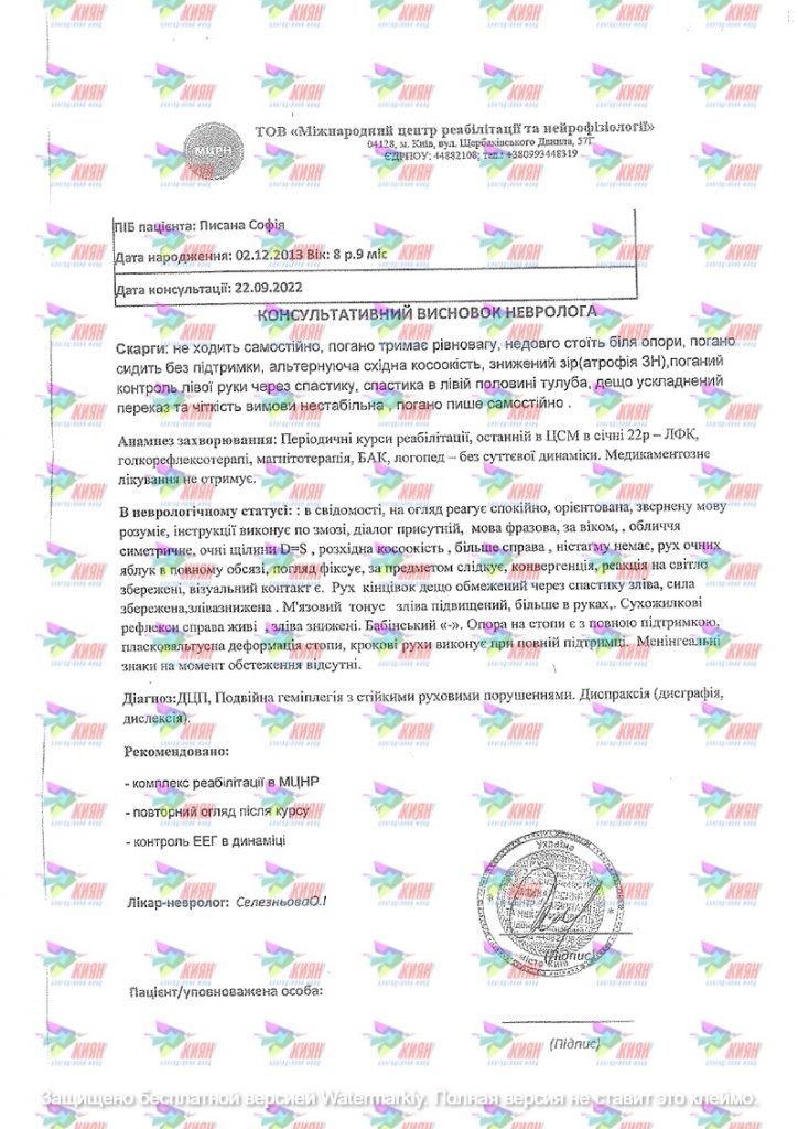 Діагноз: ДЦП, спастичний тетрапарез, подвійна геміплегія з стійкими руховими порушеннями. Диспраксія (дисграфія, дислексія). Розбіжна косоокість. G 80.0 Рівень MACS IV.