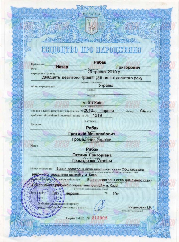 Ім’я: Рибак Назар Григорович, 29.05.2010 р.