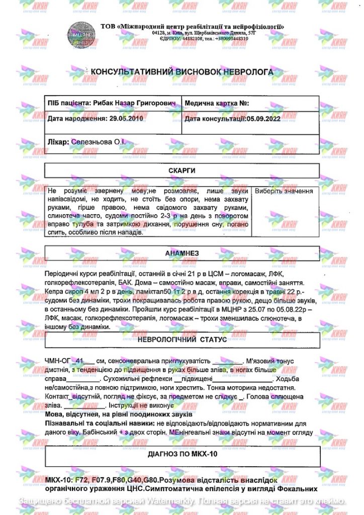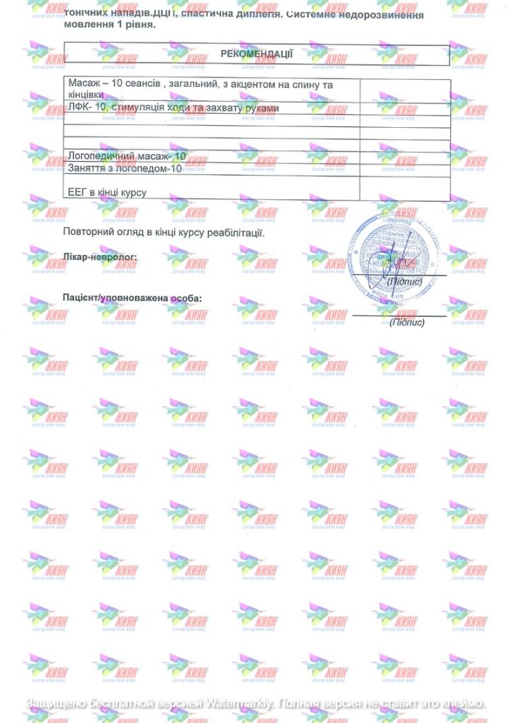 Діагноз: ДЦП, спастична диплегія, вторинна мікроцефалія, симптоматична епілепсія, псевдобульбарний синдром, мозочкова іпірамідальна недостатність, затримка статокінетичного і психомовного розвитку
