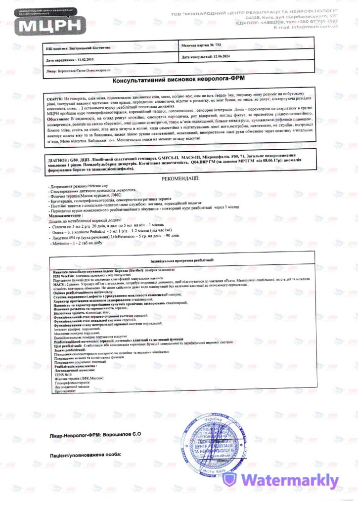 Діагноз: G.80.0 Дитячий церебральний параліч. Лівобічний спастичний геміпарез. Мікроцефалія, загальне недорозвинення мовлення 1 рівня. Псевдобульбарна дизартрія