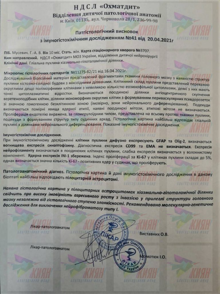 Крихітці відразу провели МРТ з контрастом, згодом Анна-Аврора пройшла консультацію в Інституті нейрохірургії ім. Ромоданова, де медики констатували: новоутворення неоперабельне, діагноз: хіазмально-гіпоталамічна гліома.