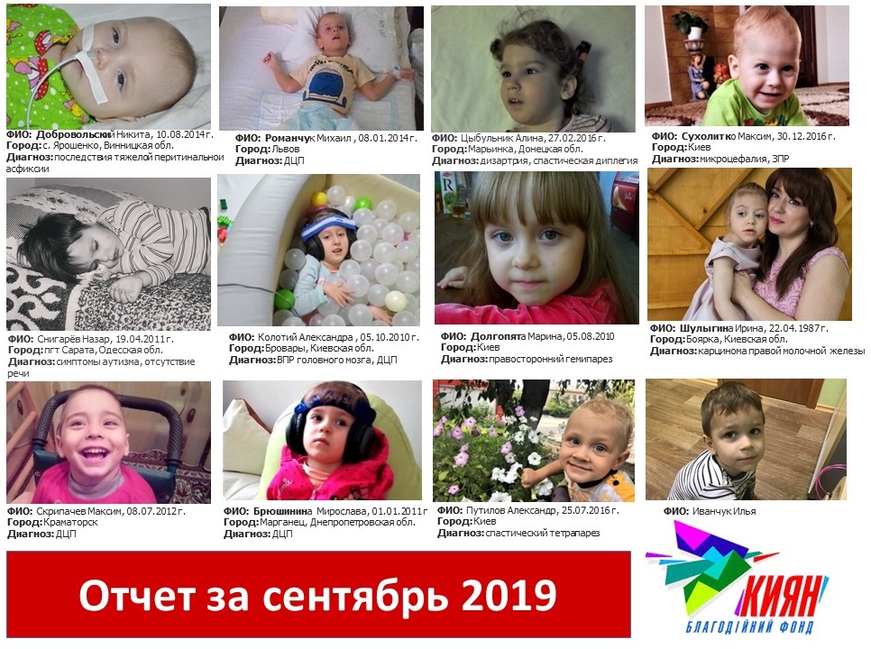 В сентябре 2019 года, благодаря Вашей неустанной помощи, было оплачено лечение: ДОБРОВОЛЬСКОГО НИКИТКИ , РОМАНЧУК МИШЕНЬКИ, ЦЫБУЛЬНИК АЛИНОЧКИ, СУХОЛИТКО МАКСИМЧИКУ, СНЕГАРЕВУ НАЗАРЧИКУ, КОЛОТИЙ САШЕНЬКЕ, ДОЛГОПЯТОВОЙ МАРИНОЧКЕ, ШУЛЫГИНОЙ ИРИНОЧКЕ, СКРИПАЧЕВУ МАКСИМКЕ, БРЮШИНИНОЙ МИРОЧКЕ, ПУТИЛОВУ САШЕНЬКЕ, ИВАНЧУКУ ИЛЬЮШКЕ!