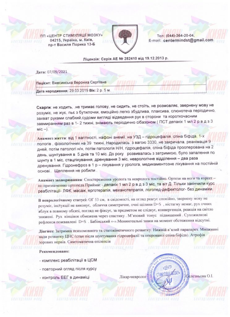 Зараз медична історія дівчинки поповнилася новими діагнозами, які не дають їй жити здоровим життям: у Вероніки нижній парапарез і порушення функцій тазових органів, дисплазія, деформація обох стоп, вивих лівого стегна, часткова атрофія зорового нерва та симптоматична епілепсія.