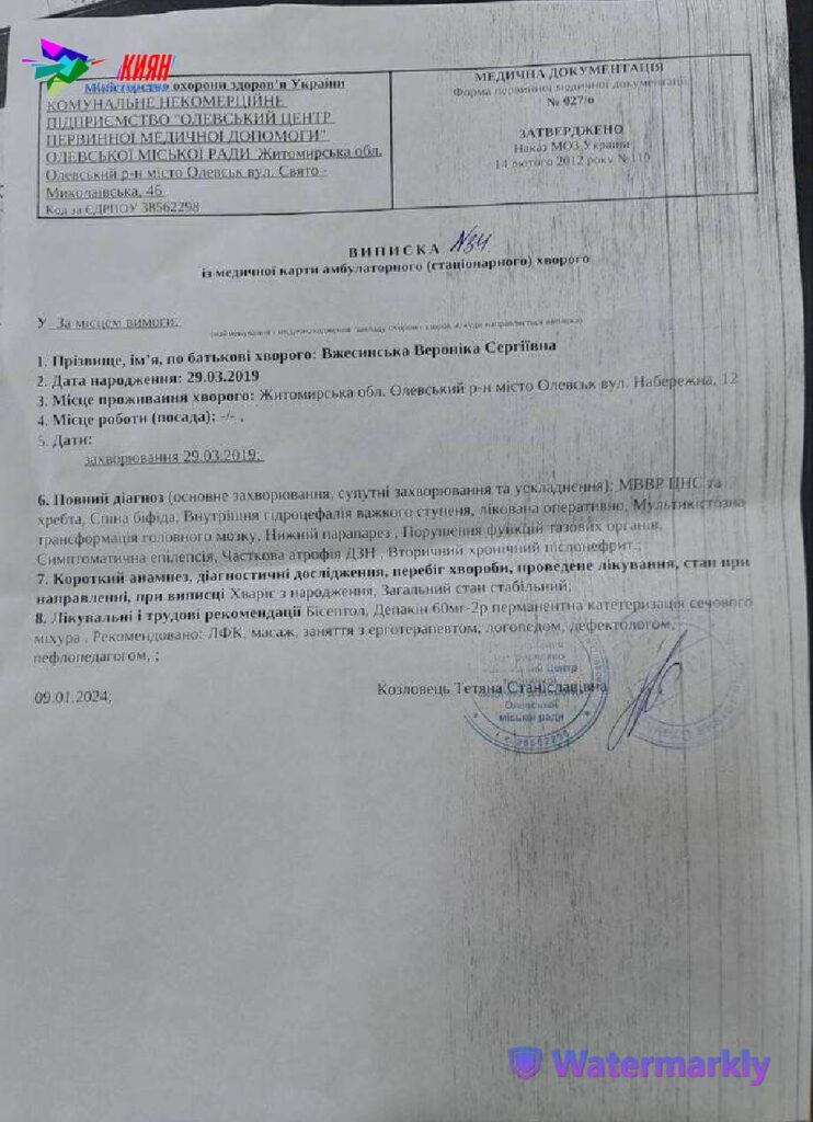 Зараз Вероніці 4 рочки, і крім вад розвитку хребта і ЦНС, у неї симптоматична епілепсія, нижній парапарез, важка гідроцефалія, деформація стоп та часткова атрофія зорового нерва. На щастя, реабілітація допомагає поліпшити стан Вероніки. Під час останнього курсу дівчинка почала показувати дуже хороші результати у фізичному, психомоторному та мовленнєвому розвитку. Вона краще розуміє мовлення та виконує інструкції лікарів. Прогрес дуже помітний, і тому припиняти реабілітацію зараз не можна.