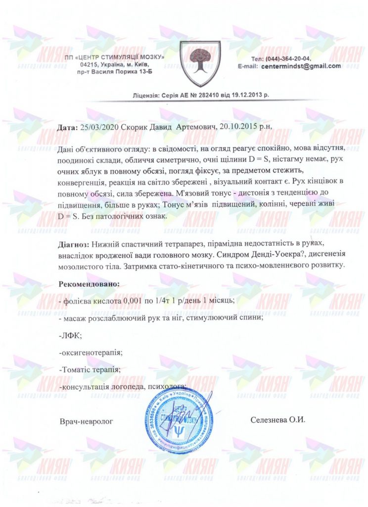 Коли хлопчику виповнився рік, він не міг самостійно сидіти, повзати і стояти. Тоді батьки і зрозуміли, що сину потрібна допомога спеціалістів. З самого початку Давидові навіть не хотіли давати направлення на лікування, аргументуючи це тим, що в хлопчика вада вроджена, і зараз нічого не виправити. Проте наполегливі батьки не здалися, і все ж почали реабілітацію сина. Після декількох таких курсів Давид почав самостійно повзати і стояти, краще розуміти батьків, вимовляти перші звуки і склади, а також ходити за руку і тримати рівновагу.