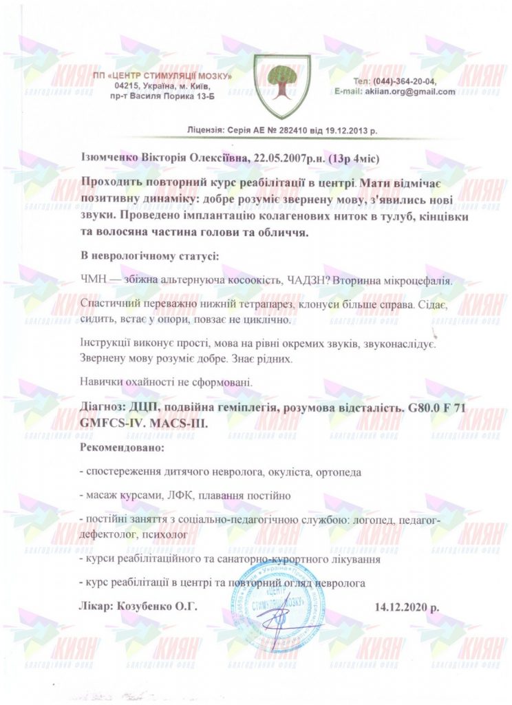 Зараз Віка вимовляє нові звуки та окремі слова, у неї укріпились м’язи спини, знизився тонус м’язів. Дівчинка всіма силами намагається навчитися без сторонньої допомоги тримати рівновагу і вже впевненіше ходить, тримаючись за руку. Таких результатів вдалося досягти після останнього курсу реабілітації в центрі «Пріоритет».