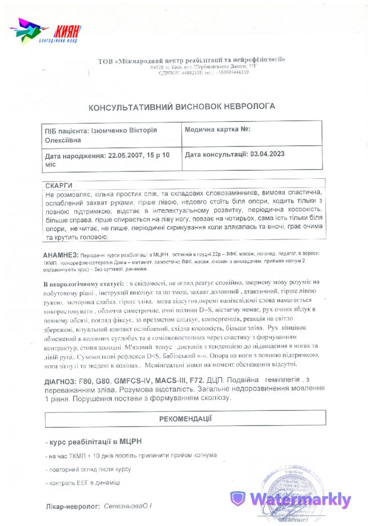 зюмченко Віка родом із Покровська Донецької області. Дівчинці 16 років, проте вона хворіє від самого народження – у неї ДЦП та синдром Денді-Уокера. Віка довгий час не тримала голівку, не сиділа, не брала в руки предмети, не стояла і не ходила, не розмовляла і не реагувала за звертання. Звісно, систематичне лікування покращувало стан дівчинки. Допоки не розпочалася повномасштабна війна.