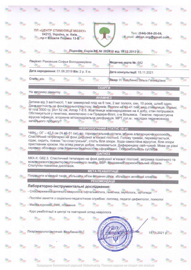 Коли Сонечці майже виповнилося 3 місяці, вона досі не фіксувала погляд і не стежила за людьми і предметами, не реагувала на мовлення. Далі нові обстеження приносили нові діагнози. Так, у Софії виявили затримку психомоторного розвитку, знижений м’язовий тонус, проблеми з очима (косоокість, горизонтальний ністагм та часткову атрофію зорових нервів). Звісно, дівчинку почали лікувати. Варто сказати, що систематичне лікування допомагає Соні: їй рекомендовані регулярні курси реабілітації.