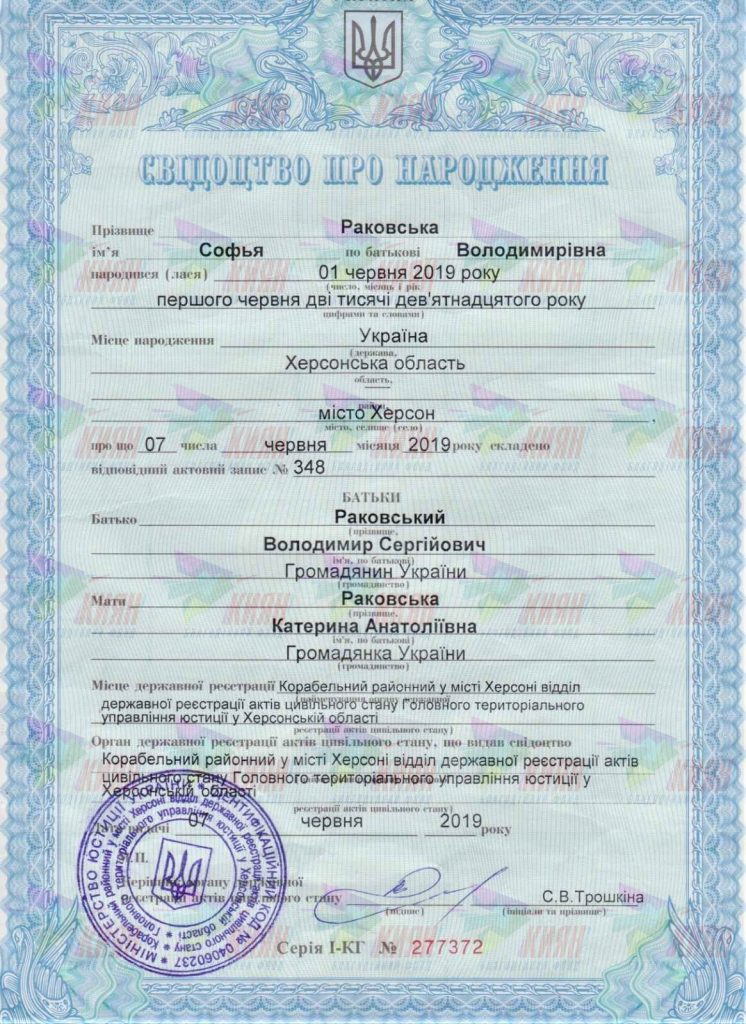 Повне ім’я: Раковська Софія Володимирівна, 01.06.2019 р.