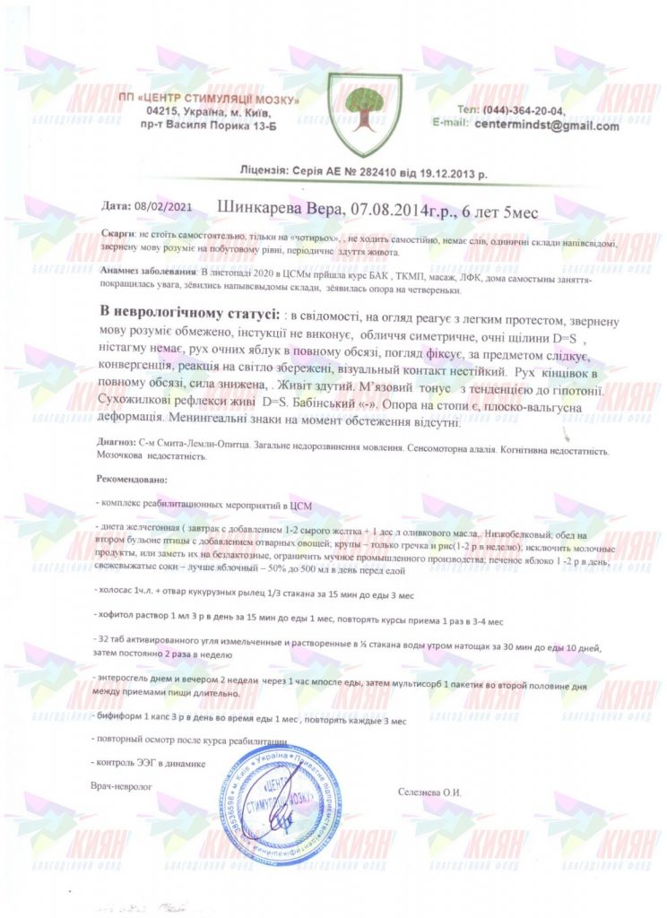 Першим етапом була операція на серці – вона потрібна була для можливості проведення подальшого лікування. Наступні етапи – боротьба із наслідками гіпоксії головного мозку, грубою затримкою розвитку, синдромом Сміта-Лемлі-Опітца. Дівчинка відвідує реабілітаційні центри, займається з лікарями і вдома, дуже старається і хоче бути здоровою.