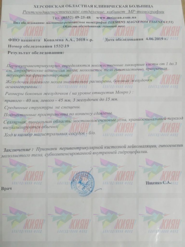 Зараз Ангеліна знову опинилася в лікарні, їй діагностували гідроцефалію важкого ступеня. Нещодавно дівчинку прооперували, встановивши дорогий шунт, кошти на який збирали всіма силами. Проте буквально упродовж декількох днів тиск у голівці почав збільшуватися, шунт не впорався з таким об’ємом рідини. Нейрохірурги планують провести ще одну операцію, щоб встановити резервуар з ручним відтоком ліквору. Це покращить стан дівчинки. Такий апарат коштує 150 тис. грн. Батьки у відчаї, адже коштів на придбання такого дорогого апарату у них немає.