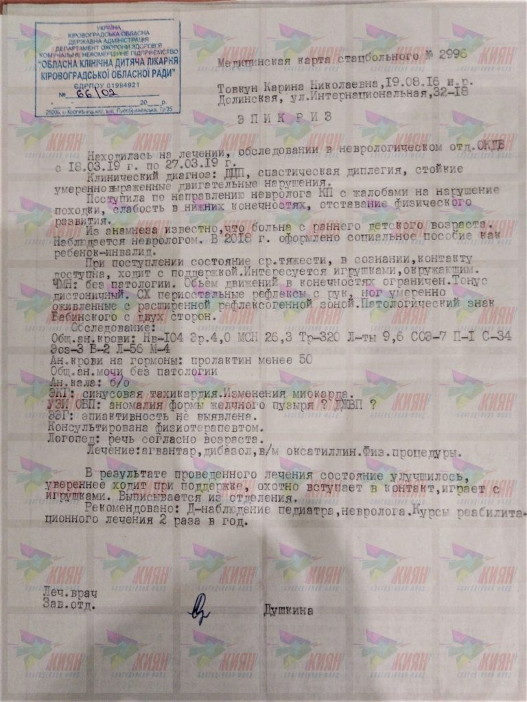 Каріна мало чим відрізняється від своїх однолітків: вона дуже любить слухати казки і пісні, вчить букви та цифри і дуже хоче навчитися читати, проте вона практично все робить лиже сидячи. Каріні вже майже 3 роки, а вона досі не повзає і не ходить… Батьки дуже хочуть, аби їх дівчинка гралася з іншими дітками і була щасливою. Вони вже витратили всі свої заощадження на медикаменти та реабілітації донечки, зараз оплачувати наступне лікування просто нічим.