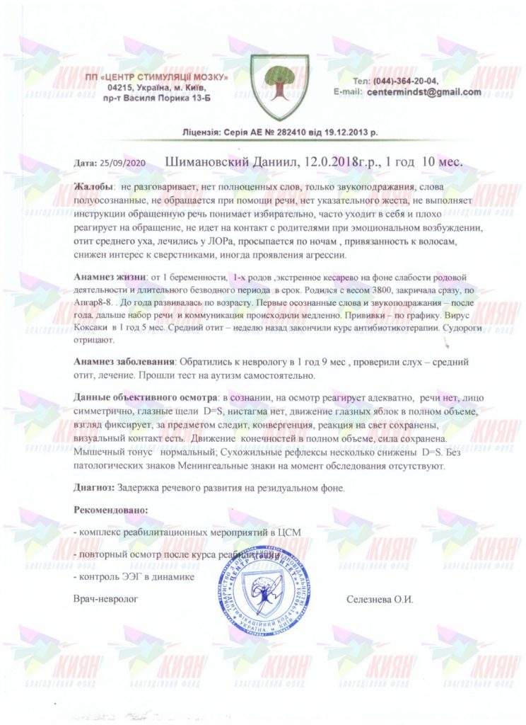 Так було встановлено, що в хлопчика затримка психо-мовленнєвого розвитку з ймовірністю розладу аутичного спектра. І щоб наздогнати у розвитку своїх однолітків, його почали лікувати. Реабілітація приносить свої результати, які дають надію на подальший позитивний розвиток Дані. Нарешті, у нього з’явився вказівний жест, причому він показує і на те, що хоче взяти, і на те, що привертає його увагу, він почав координувати свої рухи, давати предмети по чиємусь проханню, розуміти звернену мову та іти на контакт з іншими. У Дані збільшився словниковий запас, загалом хлопчик став більш спокійним, усвідомленим та уважним.
