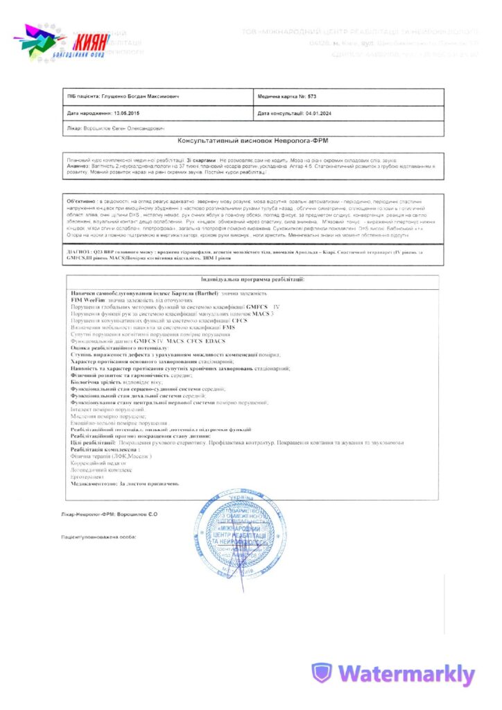 У 10 місяців Богданчик почав тримати голівку, краще смоктати та лепетати. Але, на превеликий жаль, з початком повномасштабної війни у хлопчика зʼявилася епі-активність та тяжкі судоми. Богдан пройшов лікування, йому дібрали потрібні ліки. Наразі хлопчику 8 років, у нього вроджена вада головного мозку, вроджена гідроцефалія, аномалія Арнольда Кіарі, затримка розвитку та епілепсія. Він уже самостійно сидить, жує, стоїть із підтримкою дорослих, співає, показує на те, чого хоче, сам тримає пляшечку і дуже полюбляє діток.
