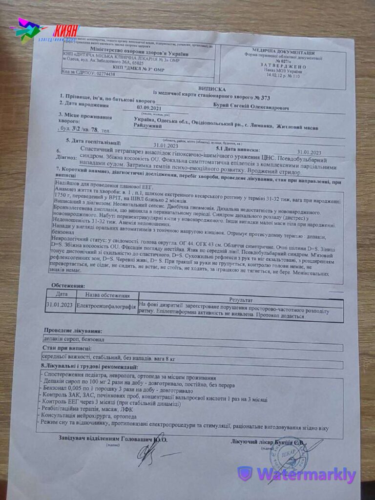 Діагноз: спастичний тетрапарез внаслідок гіпоксично-ішемічного ураження ЦНС. Псевдобульбарний синдром. Збіжна косоокість OU. Фокальна симптоматична епілепсія з комплексними парціальними нападами судом. Затримка темпів психо-емоційного розвитку. Вроджений стридор