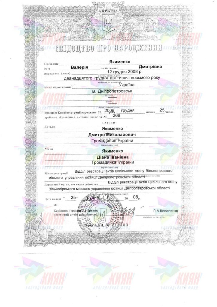 Повне ім’я: Якименко Валерія Дмитрівна, 12.12.2008 р.