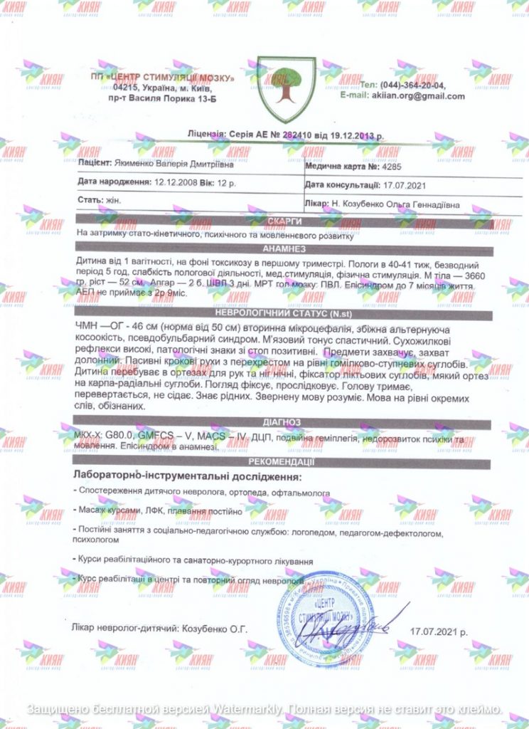 Діагноз: ДЦП, спастична тетраплегія, сколіоз грудно-поясничного відділу хребта, плосковальгусна постановка стоп, моторна аллалія, симптоматична епілепсія, період клінічної ремісії