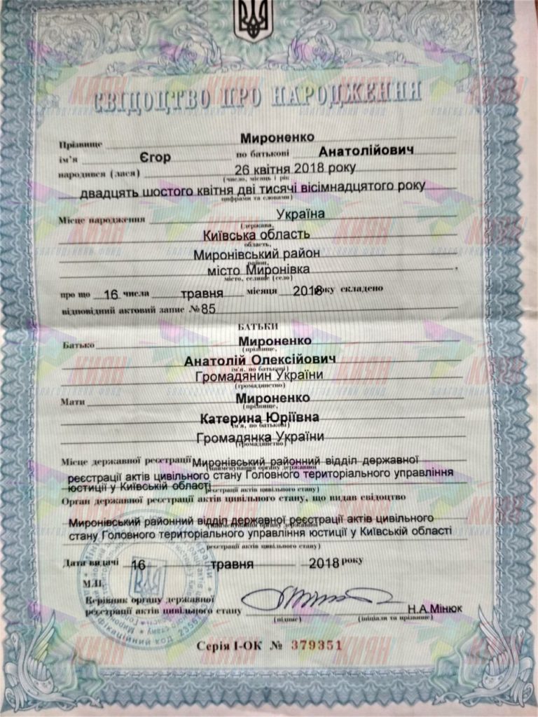 Ім’я: Мироненко Єгор Анатолійович, 26.04.2018 р.