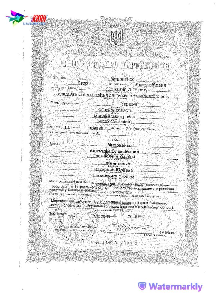 Повне ім’я: Мироненко Єгор Анатолійович, 26.04.2018 р.